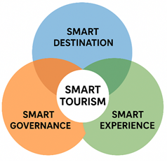 The Smart Governance pillar represents the management and policy aspects, emphasising collaboration between local governments, communities, and the private sector. This includes data-driven decision-making, open governance, and participatory approaches that empower local stakeholders. Effective governance ensures transparency, accountability, and inclusivity in tourism planning and implementation. By integrating digital tools into the governance process, local governments can respond to tourism demands more efficiently, improve resource allocation, and ensure that development is aligned with sustainability goals. Finally, Smart Experience focuses on visitor interaction with destinations, emphasising personalisation, engagement, and satisfaction through technology. This pillar utilises digital tools such as augmented reality, virtual tours, and mobile guides to enrich the tourist experience. The intersection of Smart Experience with the other two pillars creates a feedback loop that continuously refines services based on user input and behaviour analysis. Overall, the synergy of these three elements—destination, governance, and experience—builds a comprehensive model that transforms tourism into a smart, inclusive, and sustainable system.