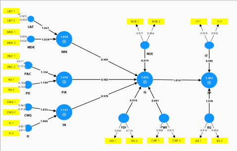Each of the dimension focuses as the parts of variable latent. Legal and Tax System (L&T) and Market Demand Knowledge (MDK) are the dimensions that measure the Foreign Market Knowledge (FMK) variable latent. Patent and Copyright Procedures (P&C) and Product Development Familiarity (PD) are the dimensions that measure the variable latent of Product Innovation Knowledge (PIK). Connection with Government Agencies (CWG) and Frequent Interaction (FI) are the dimensions that measure the variable latent of Institutional Networking (IN). Number of Export (NOE), Foreign Direct Investment (FDI), and Collaboration With Foreign (CWF) are the dimensions that measure the variable latent of Internationalization of SME (IS). Inventory Turnover (IT) and Revenue Growth (RG) are the dimensions that measure the variable latent of Firm Performance (FP)